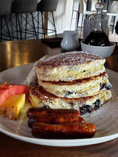 We ordered the highly recommended blueberry coconut pancakes (added a side of ham), eggs benedict with ham, and for the child, we did a single pancake with a side of sausage.