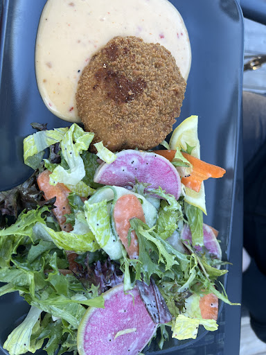 Le crabe cake (un seul crabe cake d’environ 8cm de diamètre) était bon, et on goûte qu’ils ont mis du vrai crabe, et la mayo épicée servie à côté était bonne. La salade servie avec étaient délicieuses : légumes colorés et croquants, vinaigrette moutarde et érable crémeuse et un peu sucrée.