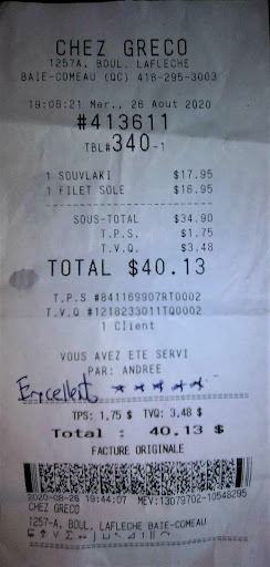 Read moreCertainement l'un des meilleurs restaurant à Baie-Comeau, il y a assez souvent du monde, il y a des promotions le jeudi et dimanche soir par exemple une goûteuses assiette de 30 belles crevettes servi en ce moment pour la promo du dimanche soir, le jeudi c'est souvent un repas acheter le 2 ème à 1$, le vin et de bonne qualité, en cuisine si il y a un soucis sur une cuisson (c'est très très rare ! ) il re cuisent votre viande ou poisson comme vous le souhaitez, un Gros Plus chez Greco c'est que les enfants de moins de 12 ans ne paye pas leur repas une lasagne ou divers choix de plats sont proposé à vos enfants donc aucun soucis de facture trop élevé, les serveuses sont souriante à votre écoute, le décor et style restaurant Grec d'ailleurs beaucoup de leur plats env. 70% sont des plats typique de la cuisine Grec avec une déco typique aussi de la Grèce, moi j'ai mangé des cuisses de grenouille elle était Excellentes l'assiette garnie d'un riz fin très goûteux, d'une salade toute aussi bonne et environs une dizaines de grosse cuisses de grenouille un régal pour les papilles ! Le pain baguette et très bon il es accompagner de beurre demi sel et de biscuit soda, les desserts sont excellents le rapport qu'elle prix et très honnête pour ma part une assiette de cuisses de grenouilles et ma femme un filet de saumon et les 2 petites une lasagne et une par de gâteaux au chocolat couper en 2 car c'était une très grosse part le tous pour moins de 60$ le pourboires c'est très honnête. Bref je recommande ce restaurant mais attention ! Bon restaurant = Réservation...