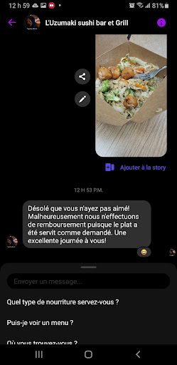 Il est 19h45, nous demandons où est la commande (2 types de makis seulement). On nous demande encore le nom de la commande en nous disant que ça ne sera pas long. Finalement 19h50, on demande un remboursement, cela fait 1h qu’on attend pour 2 types de makis.