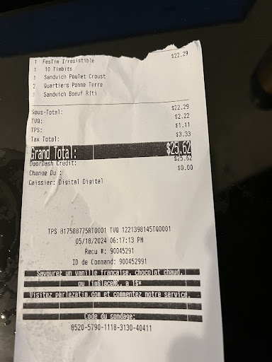 (oui ca ressemble a des croquettes) de poulet sec (pas un morceau de poulet entier) dans du pain sec avec sauce et deux feuille entiere de laitue, sandwich "boeuf roti" c des tranches de ... je pense rosbif... (si je savais j'aurai plutot acheté dans les magasins) avec la sauce dans du pain sec. aussi ils coupent un morceau de pain (on voit la coupure) en deux; les sandwich sont relativement petits. tranches de patate sec et goute congelé, timbit comme d'hab c advertisé comme un repas a deux mais j'ai tout fini seul. aussi ils veulent peut-etre que je mange avec mes mains et rien pour m'essuyer. rapport qualité prix...   Read morePlus ca va ,plusc’est pire. Minimum de 30min d'attente au service a l’auto, des imigrants qui comprenne mal le quebecois qui ns servent ,souvent les commandes sont plein d’erreur. J’avais arreter d’y aller et je pense continuer ainsi , je comprend que l’erreur es humaine et qui faut laisser des chances cependant on s’attend quand meme a un minimum de qualité. Se qu’ils ont perdu...