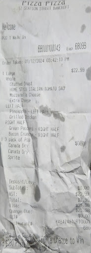 I ORDERED 1 Crave Combo (receipt attached) One-half chicken/ pineapple The other half Bacon / green pepper extra cheese on the whole thing and stuffed crust.