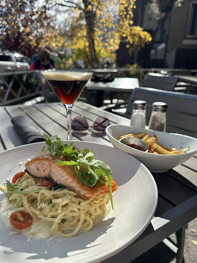 Whoever organizes the waiters stations you need to figure out a better solution. Have one waiter manage the patio tables that are attached to the inside and the nearby tables in front of the bar. Have a separate waiter that manages the tables on the sidewalk pavement area. Our waiter, he was nice enough, but he spent more time with the tables on the other side of the pavement area than the area near our table. He only came to check on our table after the busser took my overcooked salmon away, never topped up our waters or asked if we wanted anything else to drink.