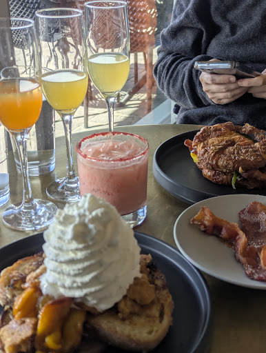 Read moreThis cosy cafe has a nice atmosphere for hanging out with a group of friends or for a date. We went for brunch. We shared the Mimosa Flight and Strawberry & Cream Marg. The Mimosas were a sample of three flavours. I'm personally not a fan of strong bubbly drinks so I did prefer the strawberry drink more. It paired well with my peach cobbler which had just the right amount of sweetness and a good mix of textures from the crunchy toast, the soft caramelized peaches to the airy whipped cream. I had a side of maple bacon which was cooked perfectly. My wife had The Best, which was a flakey croissant sandwich with eggs, tomatoes and bacon inside. I attached some pictures that show more ingredients in our dishes. They all tasted excellent. For the most part this was not a cheap meal. It would have been nice if our mains included at least one side in the price. At least they used quality ingredients and everything tasted great so I'm not going to...