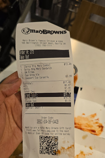 I have never had a bad experience at Mary Browns until now. I will take my business to the MaryBrowns on Essa Road. I once waited too long in line there, and the owner at that time Madonna, refunded me the entirety of my meal, stating that not only was she buying me dinner, she apologised that it took 10 minutes to warm the gravey. This was also during the pandemic. I tried refusing but it was no good. That was good customer service, this wellington street location atrocious.