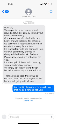 Very unprofessional and I don't think anybody should order from this store again after treating people this way.