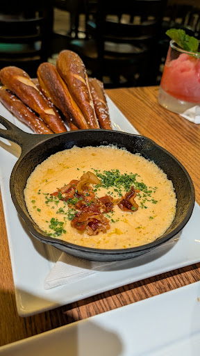 Food was pretty good, with the exception of the very bland spinach and artichoke dip. Tasted too much like over processed spinach. Needs some more flavoring and less time in the food processor. Couldn't even taste the artichoke. Portions were alright. A little on the expensive side for appetizers, average being like $15. Main dishes were priced slightly high but not to bad. Dessert was way over frozen. Had to use a knife to cut up the Ice cream. Ice cream should never ever be served in this fashion. Either the freezer has its temp settings way to low or that ice cream has been in that freezer for far to long (talking more than 30 days, which is a no no in the industry). Service was ok. Server wasn't that attentive, never came by for a food check-up. It wasn't very busy inside at all. Total of 10 tables with 3 servers, a manager, and a bartender. Food did however, arrive quickly and promptly, and hot. They did a great job with the social distancing and provided the right direction and spacing. (Mind you there was only 10 tables at the time). All in all it was a good experience, I can see that this place would have a fun vibe to it once these covid restrictions are lifted and they can be at capacity again. I would...
