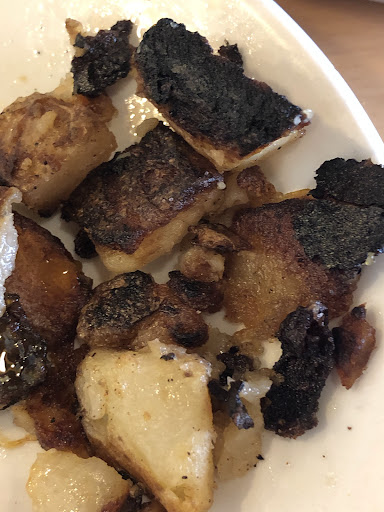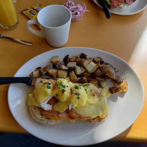 The Eggs Benedict was excellent; The Hollandaise sauce was buttery and creamy; absolutely fantastic with a generous portion of peameal and three perfectly cooked soft poached eggs on a toasted english muffin. The home fries on the side were golden, crispy, and tender one day; mostly white on another occasion, but were still good, and today they were burned while some were white.