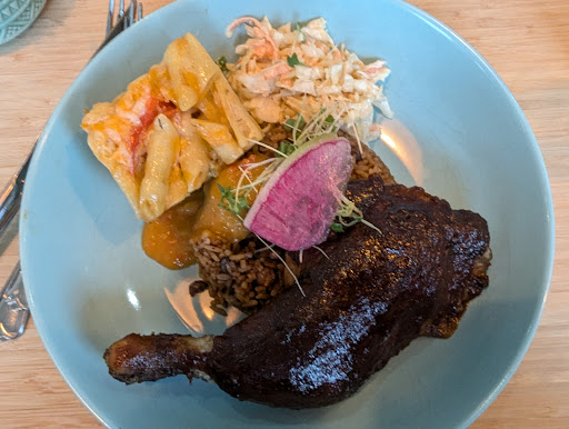 For the main course, I opted for the Bahamian Jerk Chicken Bowl. The quarter chicken thighs tossed in Bahamian jerk BBQ were tender and infused with that signature jerk spice blend, offering a perfect balance of heat and aromatic flavours. The bowl was rounded out with traditional sides of coleslaw, macaroni, and sweet mango relish over peas n' rice, creating a satisfying and authentic Bahamian meal.