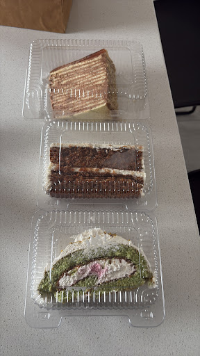 First, I prefer real whipped cream, and from the color of the rolled one, I already know it isn’t real cream. So the rolled one tastes like pistachio with a very tiny bit of raspberry and some of the cream tastes cream cheesey ( cream cheese was nice but -1 for fake whipped cream) Carrot cake has a not cream cheesey frosting (-1) (tastes like cheap gritty frosting) the cake itself is basic, not overly spiced or moist or special Finally, the multi-layered cake is new for me. The caramel top is hard and crispy, each layer is sandwiched with some cream/frosting, but not really sure what flavor it’s going for (doesn’t taste like caramel or chocolate -1), the cake layers themself taste kinda dry/stale (no idea what it’s supposed to be).