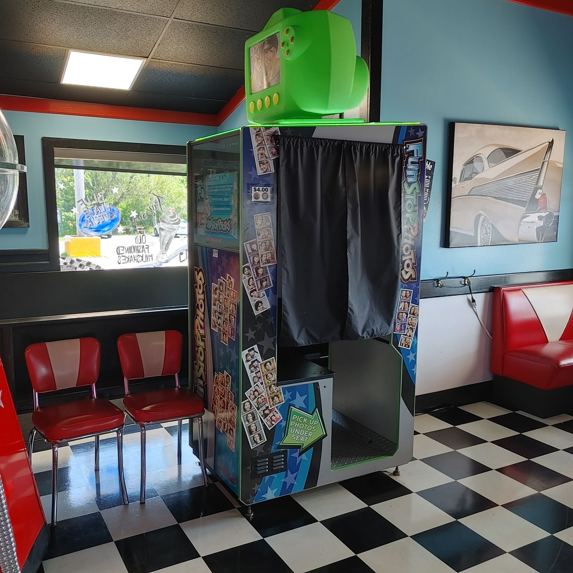 The first thing you notice when walking in is the ambiance and decor. It's like taking a trip back in time to the 50's/60's. They even have a huge bubble gum machine and an old school photo booth which you rarely see these days. They also have a projector set up that that they use to show old commercials on a large white screen that is high up where every one can watch. Please note it is not currently operational but they are looking into getting it repaired.