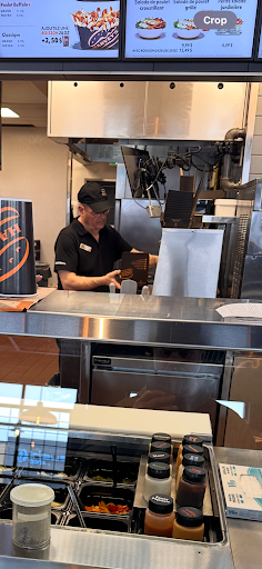 Bon point pour l’employée qui nous a remarqués alors qu’elle faisait son travail en cuisine mais que ses collègues au comptoir ne faisaient pas le leur, et pour celle qui garnissait les burgers, polie. Par contre, je n’ai pas besoin de 1/4 de tasse de mayo dans mon burger… Enfin, il y avait dans ce dernier 2 gros morceaux de pelure d’oignon, immangeables, que j’ai dû cracher pendant que...