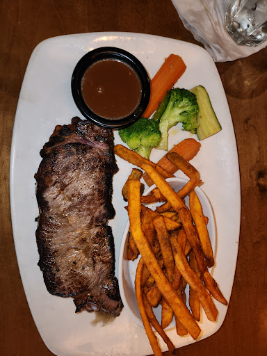 Main course A New- York strip loin , High quality meet , savored it . Side of Yam 🍠 fries 🍟. Mixed vegetables.