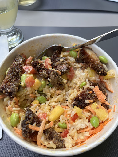 Read moreMalheureusement la qualité est en chute libre depuis leur ouverture. À l’ouverture, c’était gouteux, frais et belle présentation et achalandé. Aujourd’hui, vendredi soir 18h, j’entre dans le restaurant ça sent la vieille friture et les deux employés sont assis dans les divans et jasent par manque de client. La commande a été rapidement exécutéee ( point positif) mais c’est rendu tellement fade…malgré que le poké est noyé de sauce. Clairement, la sauce epicé est trop dilué dans la mayo. Le thon a l’air un peu douteux et les morceaux de saumon sont coupés très gros. Il manque des ingredients dans mon poké et on est loin de la presentation sur les photos disons. Bref, dommage que la qualité a bcp changé depuis l’ouverture...