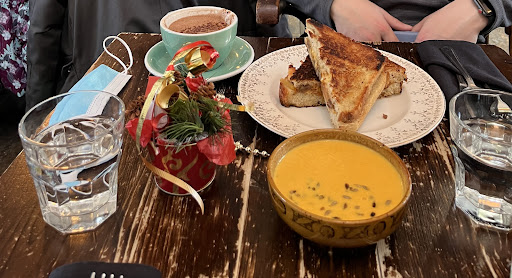 Sunday noon(I wrote wrong, it is not Monday), we were nearby and I found this place. I regretted what I had done. It is a small place. We came in and everyone saw us. We were waiting there for at least 10 minutes without any hello, and then I started to read the menu for another 5 minutes, still no one said nothing. We were very upset since it was our first time. One girl stayed inside at the cashier and the other one just talking to a very young couple( obviously they are friends). Finally I walked to the girl inside (she knew we were there since very beginning. She served a table at the entrance while we were standing there. ) Luckily she helped me to place orders and paid, I still tipped. If there is a camera the owner should find out what a bad job they’ve done. The drinks we ordered are fine, but the food is not tasty at all, even below average. The sandwich is very hard and dry. Over toasted. If I recommend my friends to come is only because beside the tables there is a fireplace, it will be good to have a drink while you were sitting...