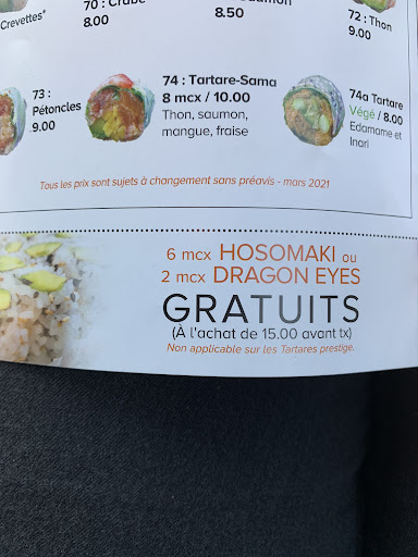 sur une commande de 75 dollars câest dommage ! nous irons voir dans un autre Sushi Sama peut ĂȘtre plus...
