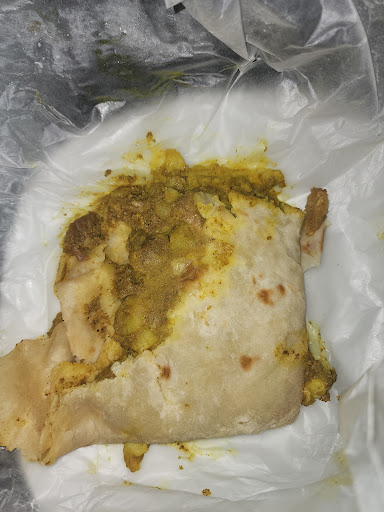 I ordered 3 boneless goat rotis, 2 with paratha, and 1 with Dahl. The dough was so super thick. It wasn't the melt in your mouth dough. It was as flat as 2 stacked pancakes. I think they did it like this to spread out the hardly there filling.