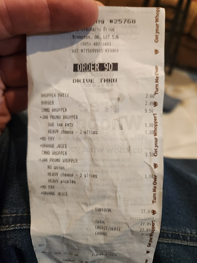 Read moreWas really peeved, I ordered a double whopper with no onions and heavey pickles. It had onions and no pickles. I also ordered an impossible whopper that was fine, and I also ordered a hamburger that if you look on the receipt you can see that what I ordered is not the same on there. I was almost home and realized that there was no hamburger, so I had to turn around cause I was charged for something I didn't get, so you could guess I was pissed. When I got home, I looked at the hamburger, and you can see in the picture that there was nothing on it, and the fries container was half full, and only 1 of the combos had fries. Your staff don't care or they wouldn't mess up like this all the time. Sorry to say, but years ago, this wouldn't fly with the managers . Quality...