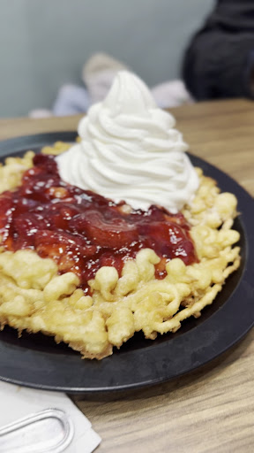Staff was friendly, food was hit and miss but the service was ATROCIOUS. We came in with a group of 6. We ordered 2 coffees, 2 milkshakes, 1 funnel cake, 1 waffle, 2 ice cream scoops and 1 poutine. The wait for the items was unbelievable. Whoever was preparing the items had no time management skills in addition to that when the items finally were ready they were left sitting on the back counter to melt. I had to get up multiple times to ask for them to give me our items that were just sitting there while one person at the cash was talking to somebody for a lengthy period of time (not sure if the person they were speaking to was a customer or a friend). At one point most of our items were sitting on the back counter and I went to the staff And asked if they could just please pass me the items. If they replied that they would bring it to the table and then continue to talk to the person. I interrupted and said are items are right there and these people have been waiting a long time (half of our group had already finished their items). She said it's okay I'll bring them and then she brought them over. Both milkshakes were just milk, pure liquid. One of them tasted literally like they just put milk in a glass. The poutine was beyond salty. The funnel cake and waffle were good but the entire experience was horrendous.