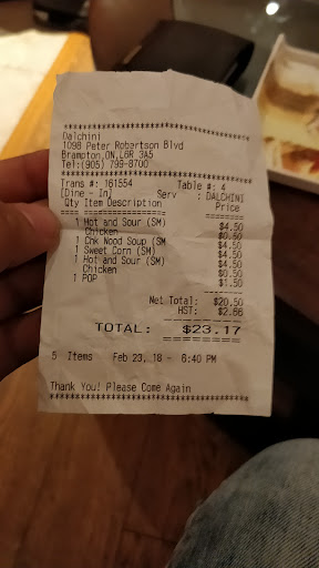 Read moreIf you are a Vegetarian DO NOT EAT HERE. I went in on Sunday, Dec. 2nd 2018 and placed an order. It was not busy at all; there was just one other person besides myself. I specifically asked for everything to be vegetarian, including no eggs either. First of all they charge HST as they should but do not provide a proper receipt with their HST number on it. I received my order, took it home and trusting Dalchini to be a respectable business who cares for their customers and quality of food i started enjoying our dinner with my family. One of the items was a Vegetarian Hot 'n' Sour soup (no Eggs) which i had ordered specifically for myself. As i am having my soup i sense something isn't right, it smelled off. I stopped eating and started to inspect it and there is was, many pieces of chicken!!!!! I instantly stopped eating and rinsed out my mouth! I felt horrible and was appalled by this! I called in and told them that this had happened and they would just say "sorry", which does absolutely nothing for me; and then they offer a credit, which i do not want! I WILL NEVER EVER EAT AT THIS HORRIBLE PLACE AGAIN, WHY WOULD I NEED A CREDIT!? I asked them to have the owner call me as i would like to discuss what happened and most of the day has passed today the 3rd with no call from the owner. Once again i am writing this review because I DO NOT WANT OTHER VEGETARIANS TO EXPERIENCE...