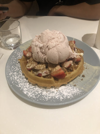 Food Presentation: When my plate arrived, I was immediately captivated by the beautiful presentation of the Belgian waffle. It was like a work of art, with the waffle placed elegantly at the center of the plate. The strawberries were arranged meticulously, forming a vibrant border around the waffle. The whipped cream was skillfully piped, adding a touch of elegance to the dish. The overall plating was visually stunning and demonstrated a great attention to detail. It truly made the experience feel special and enhanced my anticipation for the taste.