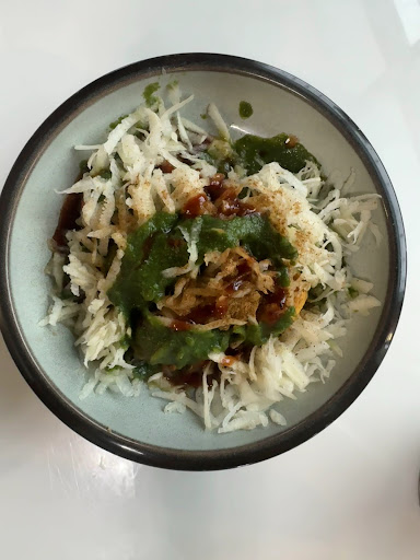 Vegan Ram Laddu - our first time - we loved it. Ordering it every time we go here. The pakora, chutney and shredded radish. A perfect dish with correct spice, textures. Vegan Kachori Chaat - a little different from next door, mostly because of different chutneys used. Very good overall.