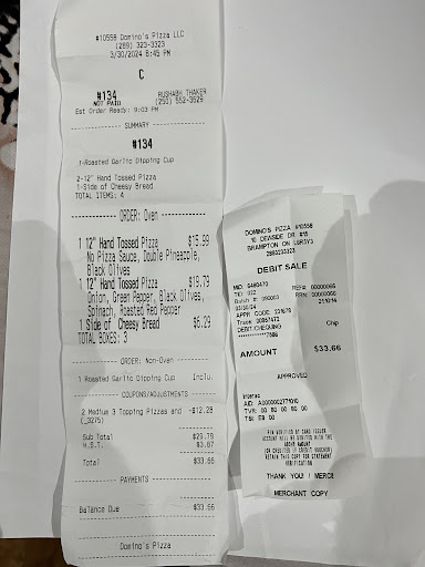 Read moreVery bad service. I came in last night around 10.40pm and ordered a Large Pizza for 13.99$ with 4 free toppings. The toppings were Italian Sausage, Beef, Pineapple and Red Onions. To my utter shock there was no Beef in the Pizza and onions also were not red. The Pizza was undercooked and very very poor in quality. I took up the matter to the girl who took my order and asked about my beef missing and pizza not having red onions and the pizza was also undercooked. She said there is beef in it and also the onions is white only and argued with me about the quality is good. She was also saying that she has been working for over a year and knows how to give or make pizza. We didn't want to argue more and came out with our pizza. Very unprofessional approach towards the client when you know it's your fault. Domino's staff is RUDE & UNPROFESSIONAL. I totally wasted my $20 which included a Fanta and Garlic dip too. Literally had to throw away the pizza as it was not at all eatable. Never going to Domino's again with...