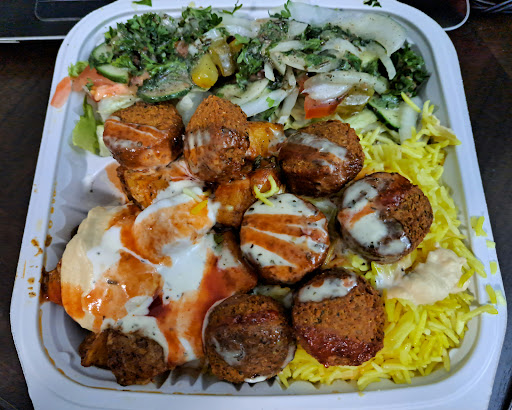 She packed the platter with a variety of veggies, falafel, rice, and dressings without any spill.