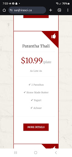 Price Discrepancy: The website listed a price of $10.99/plate for 2 Parathas, Home Made Butter, Yogurt, and Achaar. However, we were charged $15.99 on the menu. When I asked the waiter about the difference, she showed a lot of attitude and seemed unhelpful.