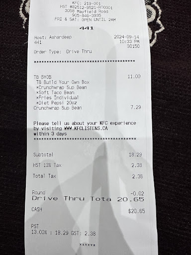 Read moreI went to drive thru of 3058 Mayfield Road, Brampton, Ontario KFC-219-001 at 10:30 PM Sep 14, 2024. Host Ashamdeep didn’t have knowledge how the restaurant drive thru works. When I went there where no car I try to order twice but she has very poor English listening skills. Looks like she is new to country who doesn’t properly trained. I had repetitively gave order 3 times. Even at the window of drivethru, then even she gave me regular fries instead of Fries supreme with the combo box order. She was not willing to listen she is started fighting verbally like I am going first time. I been in this country 20 years she don’t even understand English properly even she had an attitude to not change the order she shut down the window and left . I have asked for Lots of mild sauces she gave 3 only with 1 hot sauce and 1 ketchup with order of $20.65. I am very regular customer of taco big brand and equal treatment all the stores across North America. This is my worst experience all the years I have been going to Taco Bell. She has serious attitude issue she needs to improve her listening skill and definitely what is customer service standard in North America. Also I have try 3 times to submit customer service complaint at online on taco bell.ca but there server...