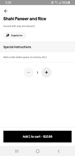 The Shahi Paneer & Rice Combo (served with pop and dessert) is advertised on UberEats, their website, Facebook, Instagram, and their online/offline menu as such. There was indication of drink or dessert options when placing the order, so I put in the comments for the drink to be Coke or something similar, and I assumed the dessert to be a pre-set item like most places do. The restaurant paused my order to say "Coke not in combo", which I did not take to mean no pop or dessert, and had already indicated a similar drink would be fine, so I did not cancel. The order arrived with no drink or dessert. My only reason for including this is so that they know to fix their menus, or provide the items as advertised in the future.
