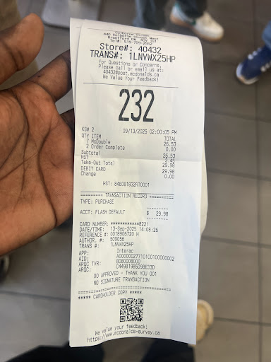 Read moreIt was nice to hear that a McDonald's was coming to West Brant but this place is so deplorable I will still drive to Stanley St. or Wayne Gretzky. Service is so slow, to alleviate this problem they decided to install a padded leaning bench so you are more comfortable while you wait. 90% of the time your order is wrong, I strongly recommend checking your order before you leave the drive thru window, this includes unwrapping your food to make sure it is what you ordered. I stopped in for a double cheeseburger, I was in a hurry so I took it & left. If I hadn't have been so far from the restaurant when I opened the wrapper I would have taken it back. My double cheeseburger was a single cheeseburger between the bottom & middle bun of a big mac. I went in tonight for the last time, the girl on the cash was totally uninterested in what she was doing, I was holding my money waiting for her to take it but she was too busy watching what was going on elsewhere so I left it on the counter. They weren't busy at all, lots of kids working, service was the usual slow wait. We picked up our trays when we were finished to go throw out our garbage, the garbage containers were overflowing, there was garbage on the floor & the trays were piling up on top, complete with more garbage because there wasn't anywhere to throw it. This is the worst McDonald's I have ever been into, head office needs to do an undercover visit. I will be...