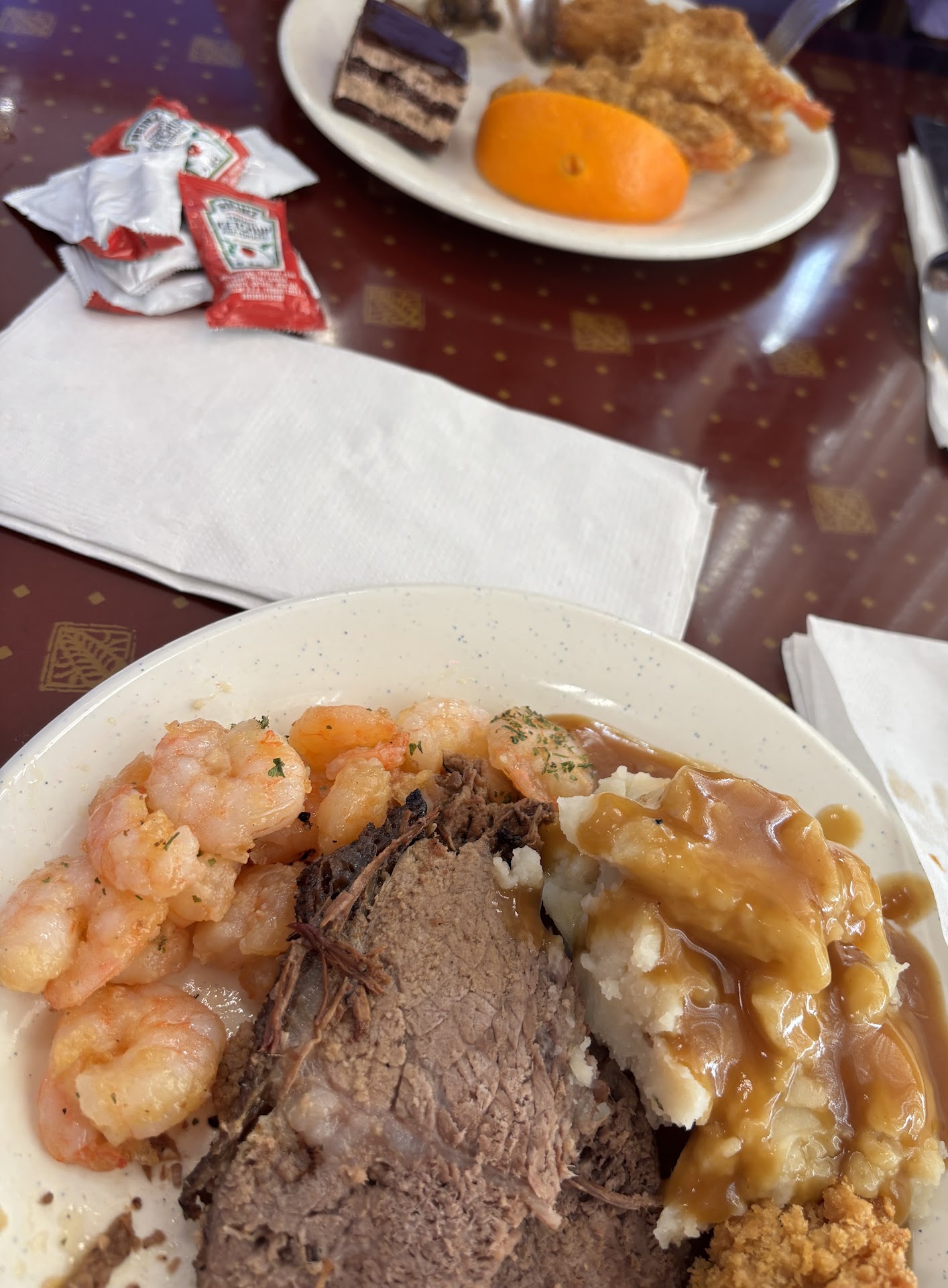 What I did enjoy: The garlic shrimp (though overcooked, it was seasoned well), the mushroom medley, mixed vegetables, and a few desserts—the mocha square and chocolate ice cream (rich, creamy, and pleasantly dark). The bubblegum ice cream was also decent.