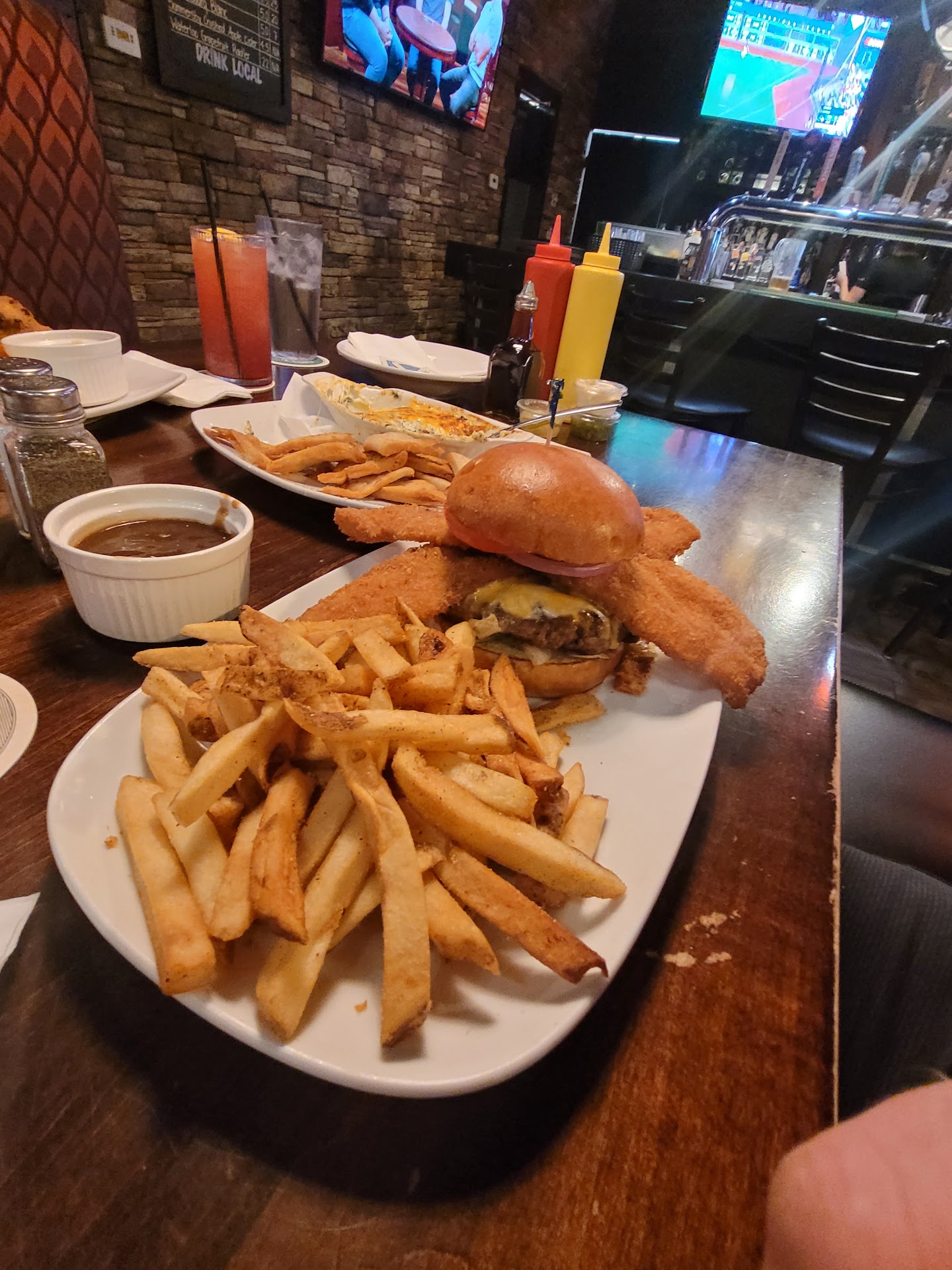 Food was good, service was not. We had a large group after a viewing at a funeral home down the road. When the first guests arrived, I guess they informed the staff they wouldn't be ordering food so the tables weren't set which is understandable. Once the rest of the party showed up, everyone decided they were hungry and would order food. We ordered quite a few shareable apps. One of the bruchetta breads was dropped on the floor at the table by the server, mistakes happen. Once she brings over the rest of the food, she left. She didn't bring over any plates, napkins or cutlery so our 3 tables were left to go grab our own stuff. She never Once came and checked on us or to ask how the food was. We asked for vinegar which never came. I ordered a second steamwhistle and was given a red beer. After waiting for 5 minutes for the server, I went to the bar and stood there for a few minutes with no one acknowledging me but plenty of staff around. Finally a woman comes up to use a till so I said hi my beer is wrong and then I also politely voiced our complaints about the service, having to get our own stuff, not getting things we asked for etc. They apologized and replaced the beer. The waitress comes over and sees that there's an empty beer bottle in front of me at the bar and asked if I wanted to add that to my bill. I said no the beer was wrong. It was steamwhistle. And she looks at it and goes yeah? I said that's not steamwhistle and another gentleman behind the bar agreed with me. 5 minutes later, our waitress comes to our table to say "I heard you complained to my manager about my service" which was weird in itself but I explained the issues. She argued with me saying the first table said we weren't eating. So I explained once we ordered food and it came out, we should have gotten plates, cutlery and napkins. She was not understanding what I was explaining and I got a very passive aggressive apology.