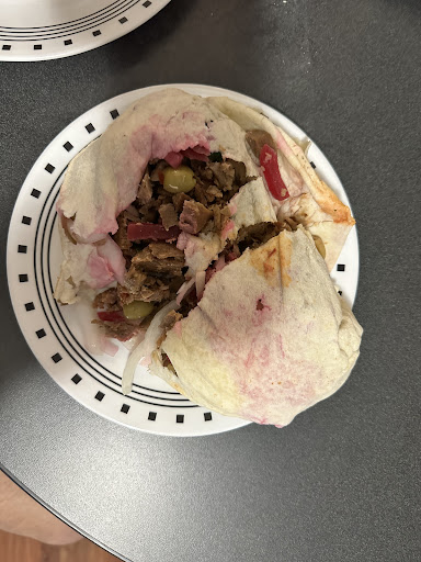 This is what happened: -I order. -He gets out a full dry pita and opens it up to make a pouch. WRONG -He puts in large wedges of tomatoes. WRONG -He puts in diced onions. RIGHT -He then turns around and shovels out of a hot bowl the sliced anemic beef and stuffs it into the pocket of the pita. WRONG -Pulls out a white squeeze bottle and squeezed something into the pocket. WRONG -Then he folds it all up into a tightly packed ball and hands it to me. WRONG -All of this took about 25 seconds.