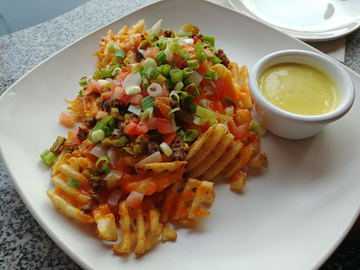 Read moreProbably a great place for drinks and snacks but I would pass for dinner. Came with a family party of 6 on a Sunday about 5:00 pm. The place wasnât very busy. We asked for a booth and ended up in one where the sun was in a couple of our parties eyes. Waitress came and we ordered drinks. They were out of Harps so I settled for a Kilkenny. Son in law ordered a cocktail that included raspberry and my grandson a raspberry slush. Even though they werenât busy (staff were standing around talking to each other) the waitress came back in a while only to inform us that they were out of raspberry syrup so couldnât make either the slush or cocktail. Switched to strawberry. Drinks finally came sans my grandsonâs. After a while longer waitress came by to tell us that they screwed up the drink and it was some grapefruit mango concoction but would we accept it. One taste and my grandson asked for what he ordered, which took more time. We went ahead and placed orders. Appetizers of a Margarita flatbread that was fine and calamari that was straight from the freezer to the fryer,not good. Son in law ordered a burger for which he requested extra sauce that never came. My wife had a âsteak sandwich â that turned out to be a small sirloin on a slice of toast. Not sure where the Himalayan salt was. I had the Extreme Pachos, advertised with spicy beef and jalapeñoâs. There was absolutely nothing âspicyâ about it. My daughter had the chicken lettuce wrap that was average. The saving grace of the meal was dessert, both chocolate conspiracy and mud pie were delicious. All in all for a slow night with slow service and only average food this would not be my...
