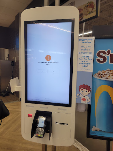 Half way through ordering via the kiosk I was informed by another customer that the interac machine didn't work on said kiosk. There was no sign to warn me and the girl at the front counter did not warn me, or the customers who tried to use it after me, whom I had to inform. Not a huge deal, mildly annoying. However the junior chicken I recieved for lunch was dry and hard. With the consistency of beef jerky. As if it was in a hot tray all night. Oh and my mcdouble tastes like mustard and still has onions on it. they obviously tried to scrape it off after...