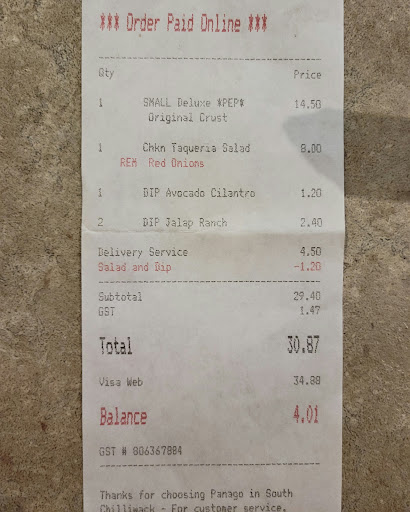 Read moreI've been going to this one for a while and once and a while there's been a mistake, fine. But the last few times, I don't know if there's a different recipe or what, the new York deli is coming more like a poor pepperoni pizza, missing many vital toppings. After literally years of loving panago, in Surrey and White Rock and a short time in Chilliwack, I'll be heading to a different pizza store from now on. Panago charges the most for pizza, it better be coming as advertised instead of the disappointment you get when home and open the box. ...