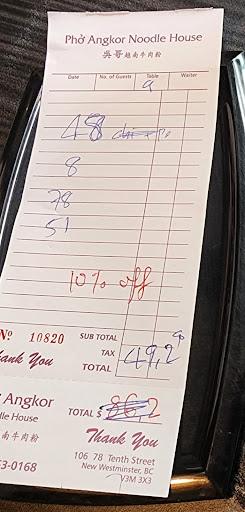 Was really surprised to get a bill with "10% off" for $86.20 when we ordered some meat on rice, chicken wings and vermicelli combo (price range from 11.75 to 17.50 per item) plus milkshake (which was 7.75 for a medium cup). Grabbed a menu, recalculated in front of the waitress item by item. My result was $51.75 before promised 10% discount. The waitress apologized, took it back to the kitchen and returned with $49.20 bill. When pointed that 51.75-10% will be $46.58, she said that she will only give us 5% off as she "didn't include taxes". I can image one can miscalculate for a couple of bucks or round it up, but excuse me - 60% on top of menu price?! Yes, we all need to pay the bills, but my family is not coming back there.