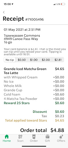 Ā Ā Ā Read moreI donāt go here as often as my work mates, but I do occasionally make a pit stop here on my way to work or for a quick break. Iāll usually place a mobile order in hopes to be in and out so I can get back to work quickly. There has been a few times unfortunately I was left waiting 15 minutes or so for my order and wasnāt acknowledged until one of the baristas asked if I was waiting for anything. While on the other hand my work mates who comes to this location often was served her drink right away.