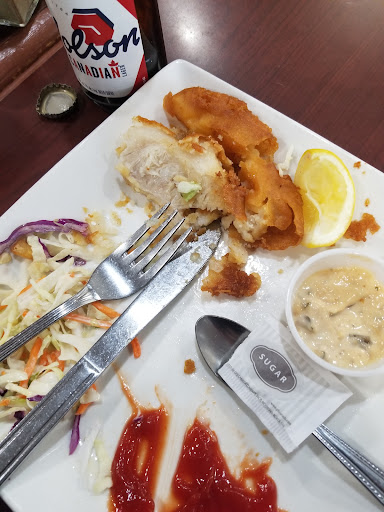 June 10th 6pm Fish and chips - 1 piece of fish was like rubber, it wouldn't flake, I couldn't cut it! Fries were good. Server seemed a little more interested in her friend sitting at a table (she is also a server), the 2 young ladies dissapeared to the washroom, leaving a new customer wondering if he could order takeaway. Coffee was only warm before I had the opportunity to ask for a spoon to stir it. Server was going to charge full price for my meal...I said no way, so she found someone who could discount my meal. My husband's meal was good. We are usually happy with the food and service at...