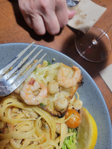 Terrible rude server, she appeared to be the manager. I took my wife there for seafood fettuccine. I've eaten it several times at Whitespot in Langley BC, where it was delicious with large 2cm scallops & 21 count prawns. What was served to us did not at all represent this. The scallops were the size of pencil erasers with the same texture, the prawns were small shrimp, and it had tiny clams in it that don't belong in the dish. The pasta was cooked properly but impossible for the chef to not overcook this tiny substandard seafood. It appeared to be mixed frozen seafood used for soup base. Both my wife and I ordered the seafood fettuccine. The server brought my wife chicken mushroom fettuccine. When my wife told the server she had the wrong dish, the server said the chicken fettuccine was "her favorite." When I asked for some fresh ground pepper she rudely commented, "We don't do that here." By the time my wife had her order, I had almost finished mine. When I respectively showed the server how small and overcooked my seafood was and that it was not consistent with the Langley Whitespot, she rudely said, "What would you like me to do about it! " and walked away. She came back and said, "We order from the same supplier SISCO." Sisco is a restaurant supplier where you can order any size prawn, scallop They are obviously ordering substandard product not consistent with the franchise's menu. She also served me a glass of wine 5 minutes before the $6 happy hr, saying it was only $2 more, then charged me $13 over double. The attitude this server expressed to us and her other customers was appalling, and we were not the only wrong order, customers came in just as we were leaving returning their wrong order, commenting, " lesson learned". What an experience. I took my wife out for a nice dinner together, then watched each other eat, lol. I took some photos so you can judge for yourselves. Notice how small the prawns are, and the little round things are the scallops. Not sure this is what James Kennedy had invisioned when he created Whitespots new menu, or how he wanted his customers...