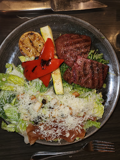 I took a scoter cut steak in sea salt , totally delicious it was served with grilled Zucchini and red peppers accompanied By a Ceasar salade 🥗 😋. Note they use real bacon 🥓, not bacon bits , and also add capers in the Ceasar, Make an excellent and delicious salade .