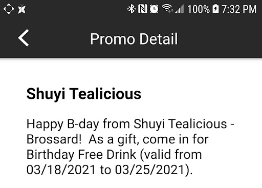 So in the Shuyi app, you have the "PROMO" icon where it says "As a gift, come in for Birthday Free Drink". So I clicked on it, nothing happened. I say ok, maybe I needed to physically come in to the store to order the drink.