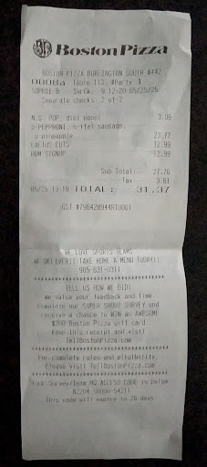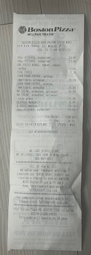 It's sad to say as I've had many pizzas from Boston Pizza before that were amazing. This particular location just couldn't live up to the standard of pizza that a Boston Pizza should be providing.