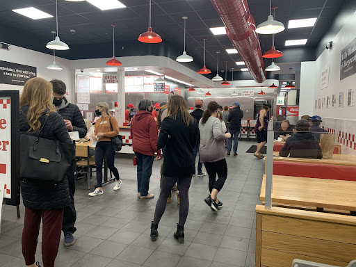 Read moreNoisy, overpriced, chaotic... is what I would say about my experience here today. My son wanted to have Five guys burger for dinner so we went in. Place is busy so folks clearly like it here, but I think its overpriced and over rated. Extremely noisy inside with staff shouting numbers at customers (who can't hear because the place is so noisy and everyone is shouting). Invest in a cue system with number display or something. No one in this place is following any covid protocol... even staff is telling us to shuffle along and bunch up with people in front ... very strange... and uncomfortable. We stood bunched up with tons of other people for over 20 mins for our 2 burger order. Actually 22, but who's counting. I think more frustrating was to see countless uber drivers come in and out within 2 minutes while we all stood there bunched up waiting patiently for our order. as for the food... i think the burgers are not worth the money. I'll take a grilled burger over a fried burger anytime. My son though the bun was very good... just enough seeds, but not too many.. the cheese was "melted perfectly" and the patty was ok. The bummer for him was that the patty is smaller than the burger so three quarters through the burger you end up with no patty and lot of bun left (see photo). he has five guys number 5 on his burger list (1. Hero, 2. BK, 3. A&W, 4. Harvey's, 5. Five guys, 6. McD's, 7. Wendy's.) love the list. I do like the fries, once they cool off they are good with good amount of seasoning. Still think over $28 for two burgers and one fry and no drinks is ridiculous.. especially for what you get. The lack of distancing here still boggles my mind... I guess that's why province is shutting restaurants...