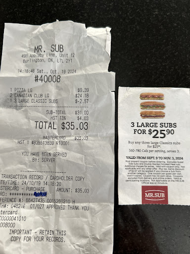 Read moreOn October 19th 2024 my 25 year old daughter and I entered this location at 491 Appleby Line. I handed the older lady the coupon before ordering and asked what subs this applied to. Her response was any of them. We ordered a pizza sub and 2 Canadian clubs. When it came to toppings we asked for cucumber we were given 4 slices on each foot long. The tomatoes were mushy and the lettuce was brown. The pizza sub gets warmed up in a microwave??? When it came time to pay I was surprised at the total. I asked if they applied the coupon. The older gentleman said they had and the coupon was only valid on 1 sub. I reminded them that I had asked in the beginning which subs the coupon applied to. They told me I should have read the coupon myself. I asked what if I can’t read or have a disability of some kind. The older gentleman’s response was “you are from Canada right.” They continued to raise their voices and talk over me. I told them I would make sure others know the quality is terrible! It’s the bad attitudes they both displayed combined with poor customer service that will keep me out of this establishment in the future. So...