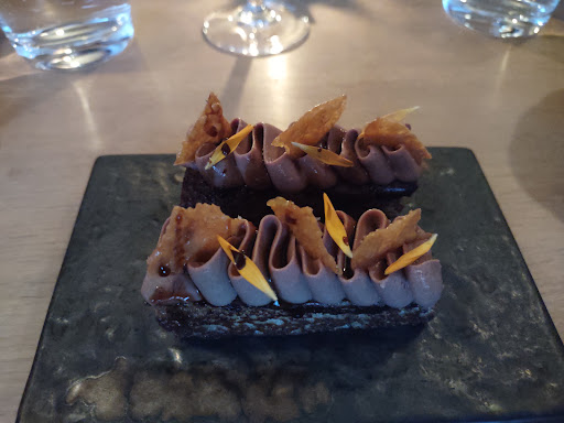 My wife and I ordered off the a la carte menu. They also have a degustation menu, aka tasting menu, three pizzas & three desserts on the menu. We like to share everything so ordered a bunch of appetizers - French Toast (chicken liver mousse), Crudo (toro sawara), Beef Tartare -, a pasta course - Triangoli (butternut squash) - , one main to share, Beef Cheek, and shared the Persimmon dessert. Plus, a cocktail and a Rioja wine with the Beef Cheek.