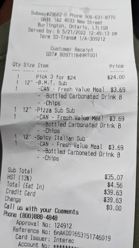 Read moreI ordered a sub through the Subway app at around 9:30am for 12:30pm lunch pick up. My visa card was charged and order was placed promptly. I went there at 12:30pm to pick up my sub, and the lady working at the cash register said there was no online order or me. She searched and searched and couldn't find it. I checked the Subway app again, and clearly the order was placed and the location of my order was correct. After a couple of minutes I decided to check my email to see if there's more detailed receipt for my order in there to show to the cash register lady. Receipt was there, but I also received cancellation email at 12:17pm from Subway that apparently (13 minutes before my scheduled pick up time) my order was CANCELLED?!?!?!? What??? No idea who and why cancelled it!!!!! This is just ridiculous!!! Good there's Tim Horton's on the same plaza so I still had time to eat lunch before...