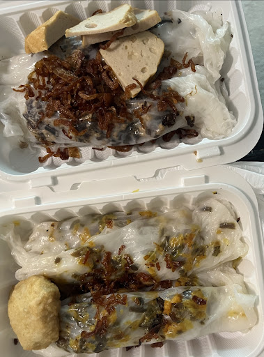 Each order comes with 4 rice rolls. I tried 1 order: prawn and 1 order: pork. Both were great! (The menu doesn’t list pork or chicken but the employee verbally said they have the following 4 options to choose from: prawn, beef, chicken or pork.) Its generously topped with in house fried shallots and comes w a Vietnamese ham (refer to pic) bag of veggies (bean sprouts, lettuce, basil and cilantro.) sauce options too choose from are: soya sauce, fish sauce or a in-house sauce (taste like a sweet onion beef broth.)